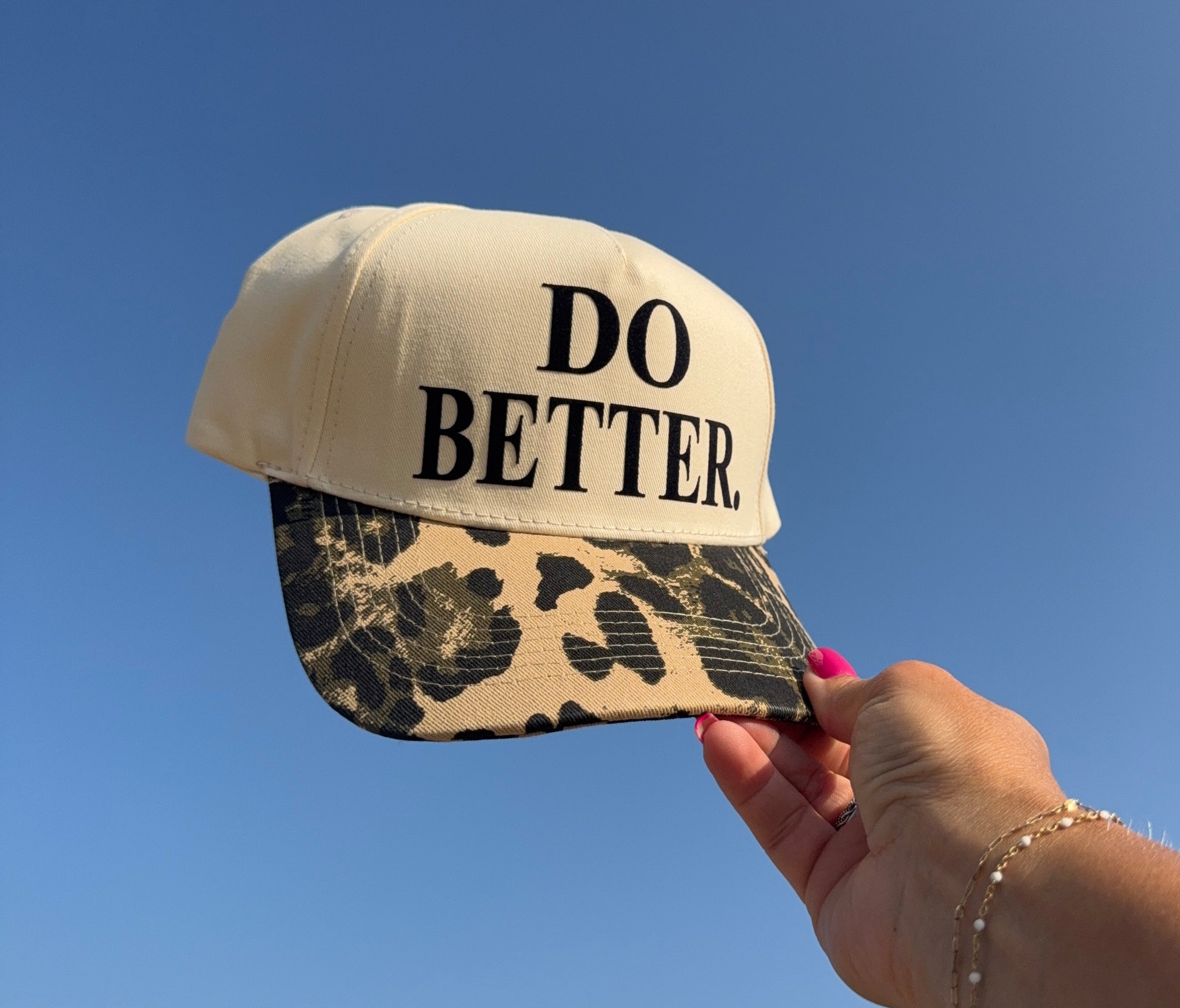 This playful leopard-print trucker hat features a bold "Do Better" message printed in soft flock, designed to inspire those around you to push harder and support each other. With its adjustable fit, it’s the perfect accessory to remind everyone that a little encouragement goes a long way. Wear it, share the vibe, and be the motivator in your crew!